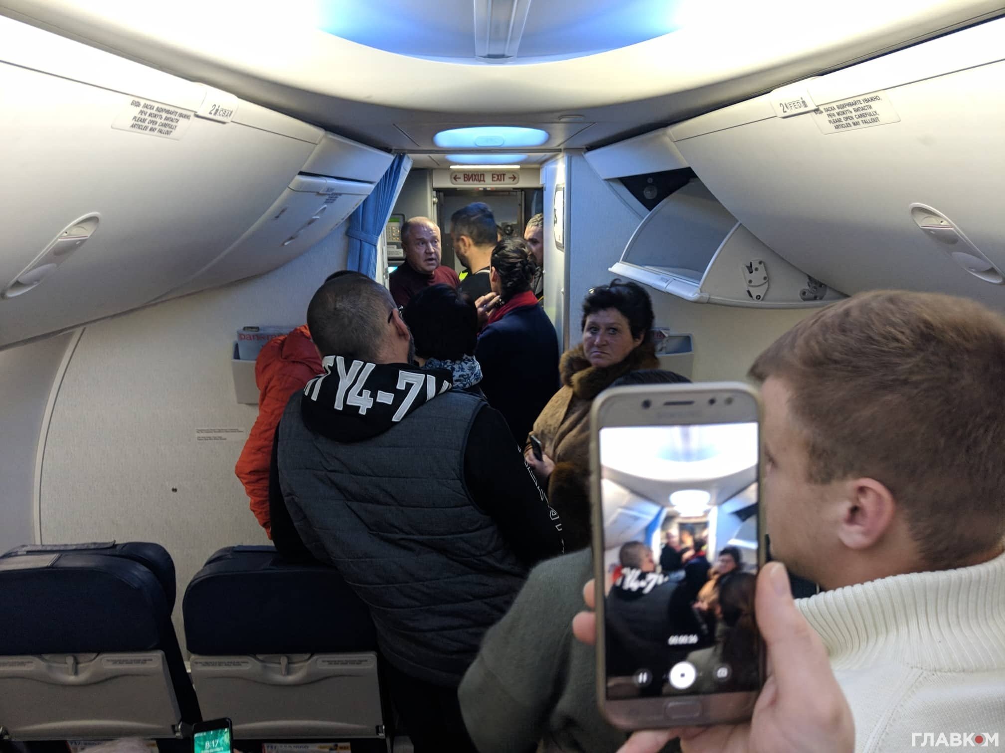 Станом на 20:23 пасажирів літака, що сів у «Жулянах» не випускають з нього. Вони вимагають від екіпажу випустити їх. Пасажири розцінюють це, як тримання у заручниках. Пасажири намагаються вирватися з літака.