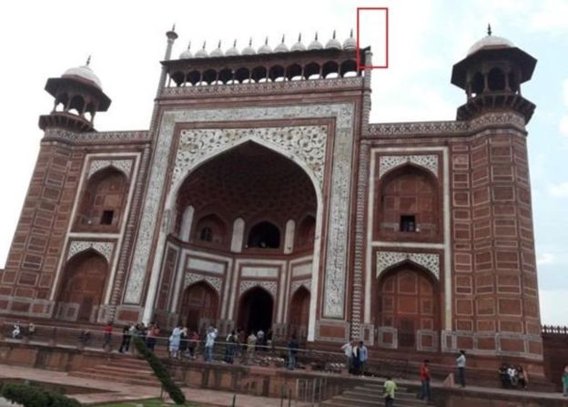 Один зі зруйнованих мінаретів розташований біля королівських воріт до Тадж-Махала, і туристи легко можуть помітити завдану шкоду.