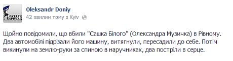 "Щойно повідомили, що вбили "Сашка Білого" (Олександра Музичка) в Рівному. Два автомобілі підрізали його машину, витягнули, пересадили до себе. Потім викинули на землю-руки за спиною в наручниках, два постріли в серце", - повідомив Доній.