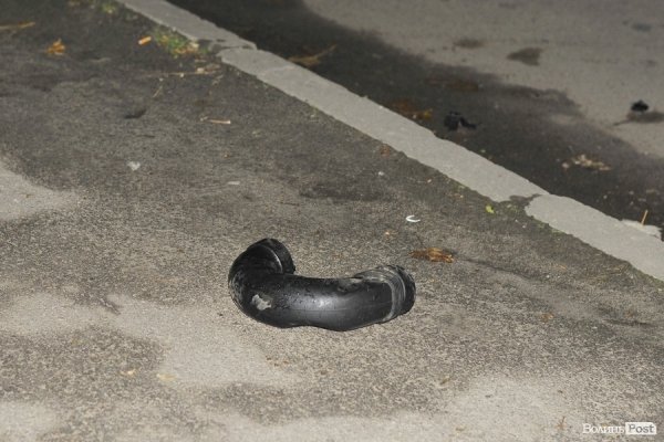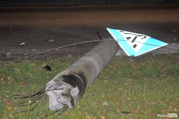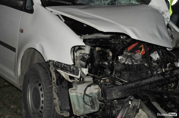 Опора та передня частина автомобіля зруйновані вщент. Потерпілих, на щастя, немає. Але водій Фольксвагену з місця аварії втік.