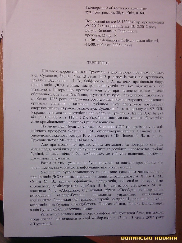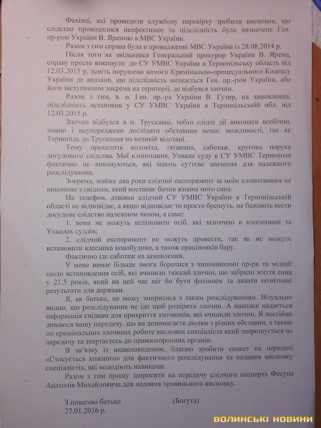 - З 22 по 25 лютого в Трускавці проводився експеримент слідчих дій із свідком, який начебто останнім бачив живим мого сина, - розповідає згорьований батько Володимир Богута. - Приїхали 2 слідчих із Тернополя. Два дні перешкоджали потрапити на новобудову, щоб провести слідчий експеримент. Свідок умисно не з’явився. Закрився у квартирі. На роботу не виходив. Відтворення подій відбувалося без свідка. Встановили, що покази свідка протягом 9 років про те, що він останнім бачив живим мого сина, не відповідають дійсності і це підставна особа.