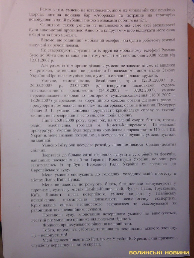 Батько впевнений що причина смерті зовсім інша, а тому не покладає рук у пошуках справедливості в розслідуванні обставин його смерті. Однак до цих пір жодних акції протесту, влаштовані ним, звернення до депутатів усіх рівнів та фракцій, найвищих посадових осіб та гаранта Конституції України йому не допомагали.