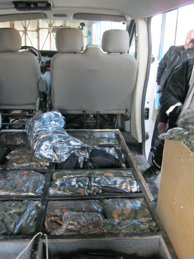 Прикордонно-митна оглядова група під час оформлення автомобіля помітила коробку, що була прикрита одягом. Як виявилося, у ній був арбалет зі стрілами. Крім того, в спеціально обладнаних сховках - у подвійному днищі та бокових стінках мікроавтобуса знайшли сто комплектів камуфляжних костюмів та маскувальних халатів. Як пояснили росіяни, спорядження вони везли для своїх друзів-мисливців.