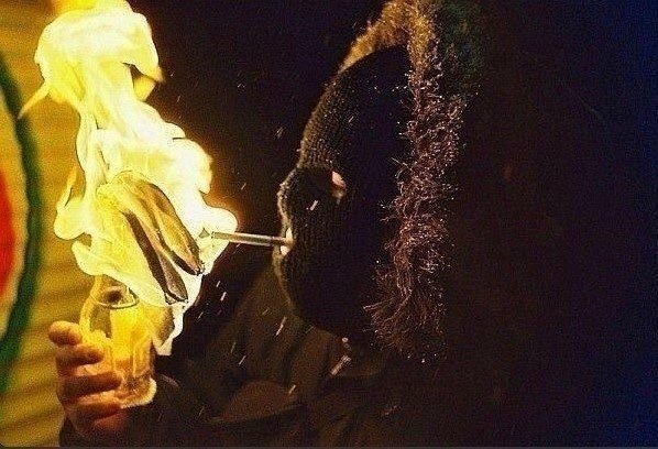 Ніч понеділка. Мітингувальник чи то прикурює від коктейлю Молотова, чи то запалює його. Фото невідомого автора