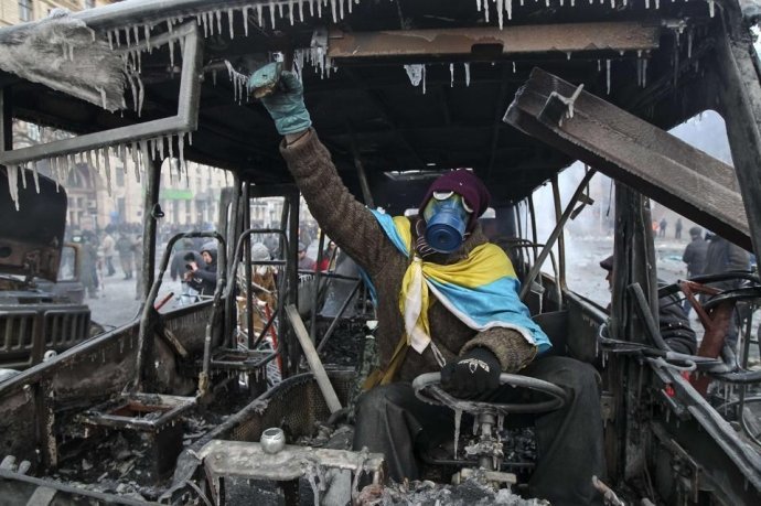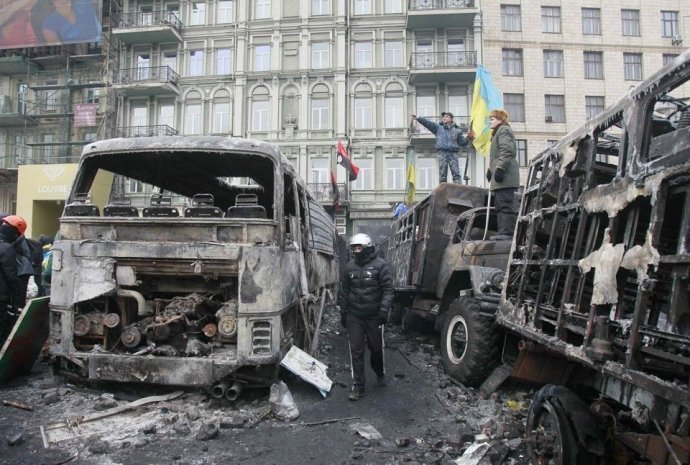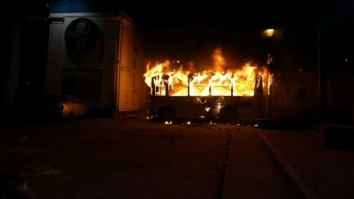 Догорає автобус "Беркуту". Портрет Лобановського ще цілий. Фото невідомого автора