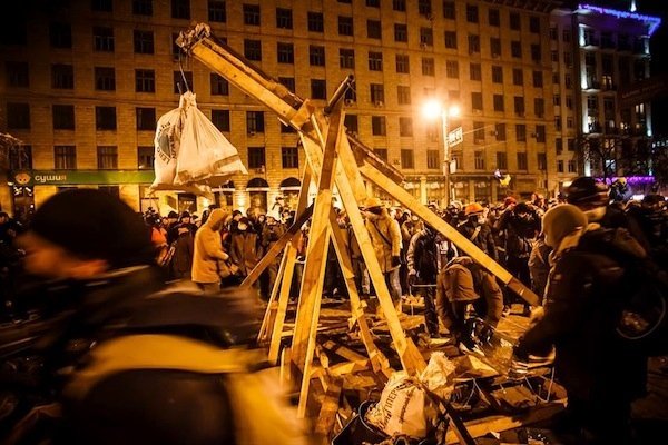 На другий день протистоянь мітингувальники почали споруджувати саморобну катапульту. Через деякий час вона вийшла з ладу. Фото - Дмитро Ларін