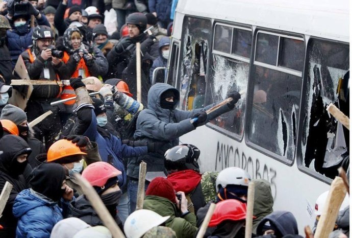 Початок протистояння. Мітингуючі, яких не пропустили до Верховної Ради, почали трощити автобуси "Беркуту". Фото Reuters