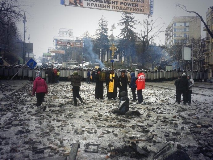 Священики у вівторок зранку встали між двома сторонами і закликали до примирення. Здебільшого вони зверталися до протестувальників, а не до "Беркуту" та бійців МВС. Фото невідомого автора