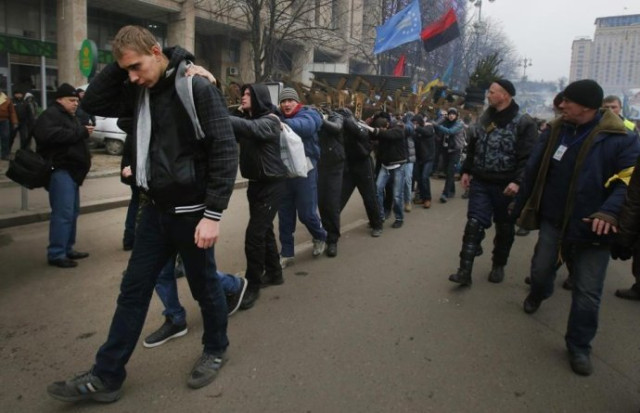 Відловлених за ніч "тітушок" ведуть на Майдан, щоб вони вибачилися. Фото AP