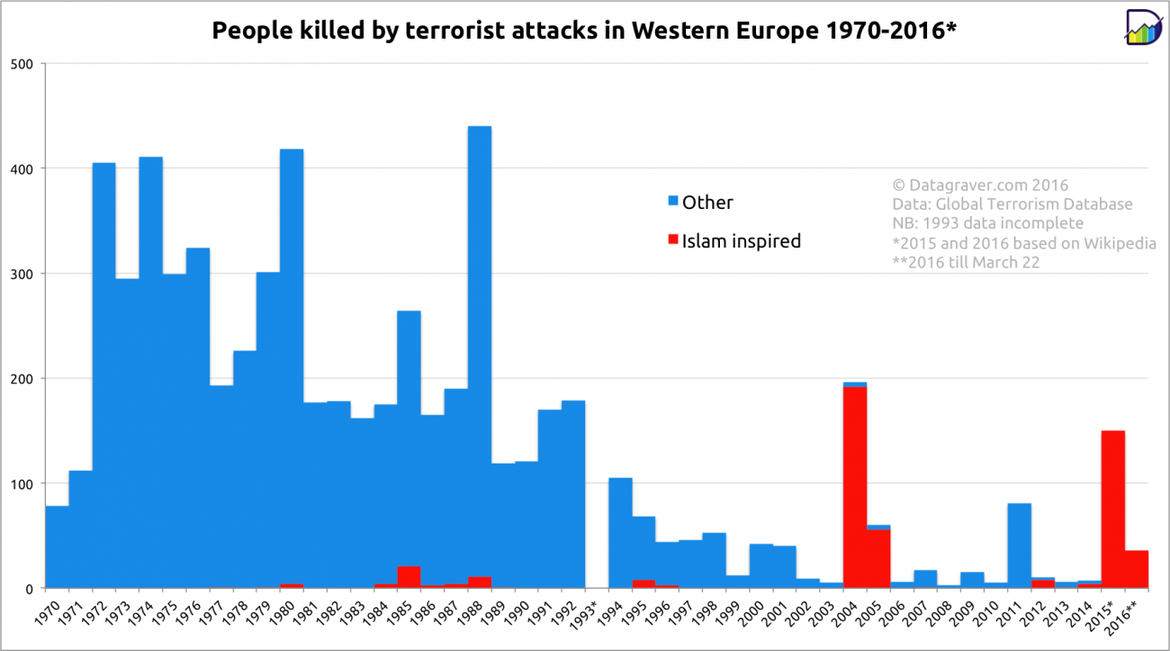 Такі дані зібрав та опублікував Datagraver після останніх терактів у Брюсселі, коли вранці 22 березня 2016 року пролунала низка вибухів в аеропорту та на станції метро у кварталі, де розташовані установи Європейського Союзу. У результаті терористичних атак у Брюсселі загинуло щонайменше 34 особи.