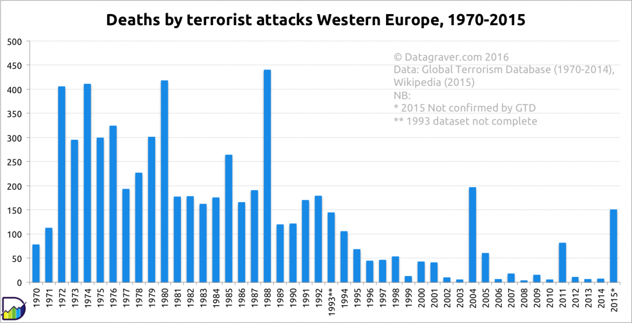 Від терористичних нападів минулого року в Західній Європі загинуло 150 людей. Однак це далеко не найкривавіший показник за останні десятиліття – у 2004 році було вбито 196 чоловік. У тому ж році померла 191 людина внаслідок нападу в Мадриді.