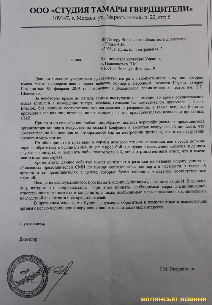Згодом у листі-претензії до культурного закладу (повний текст подано нижче), згадана особа-організатор «відпишеться» «іменем директора» ООО «Студия Тамары Гвердцители».