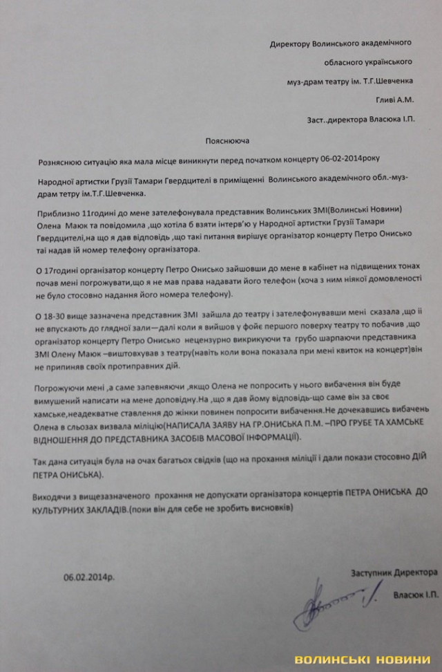 Так, на запрошення заступника директора облмуздрамтетатру Ігоря Власюка, журналіст Інформаційного агентства Волинські Новини прийшла у театр, але перед залою охоронець у грубій формі заборонив їй пройти до зали. У цей момент швидко примчав Петро Онисько.