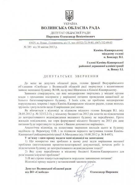 Анатолій Вітів доручив голові фракції «Свобода» в обласній раді Олександру Пирожику подати офіційний депутатський запит на ім’я Камінь-Каширського голови Василя Бондаря.
