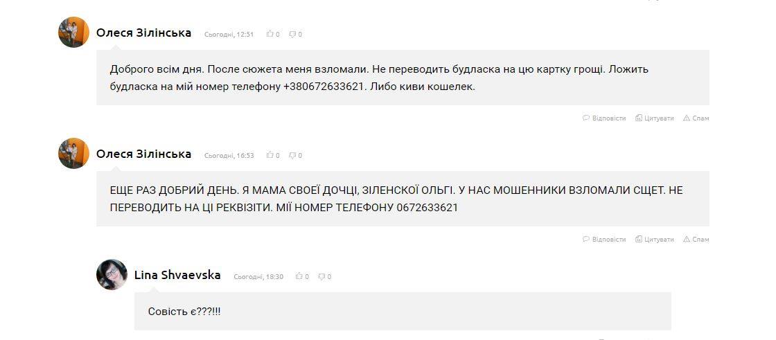 Своєю чергою, у коментарях до допису користувач Григорій Лищишин оприлюднив скріншот переписки з невідомою особою, яка, вочевидь, є аферисткою та просить скидати гроші, призначені на допомогу, їй на телефон.