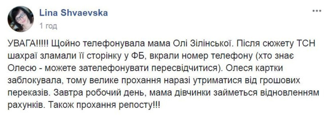 Також зазначається, що після сюжету ТСН, у якому всіх небайдужих просили допомогти 9-річній волинянці, нечисті на руку люди вкрали номер телефону Олесі Зелінської (мама дівчинки, - ред.)