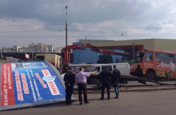 Маршрутку, що збила рекламний щит, відвозять з місця ДТП. ФОТОФАКТ