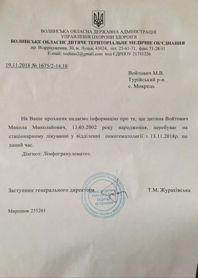 16-річний житель села Мокрець Турійського району Микола Войтович вже 7 місяців бореться з онкологічним захворюванням – лімфогранулематозом. Юнак вже пройшов 5 сеансів хіміотерапії, проте для того, аби завершити лікування в сім’ї не залишилось коштів – ні власних, ні позичених. Небайдужих волинян просять допомогти врятувати життя юного хлопця.