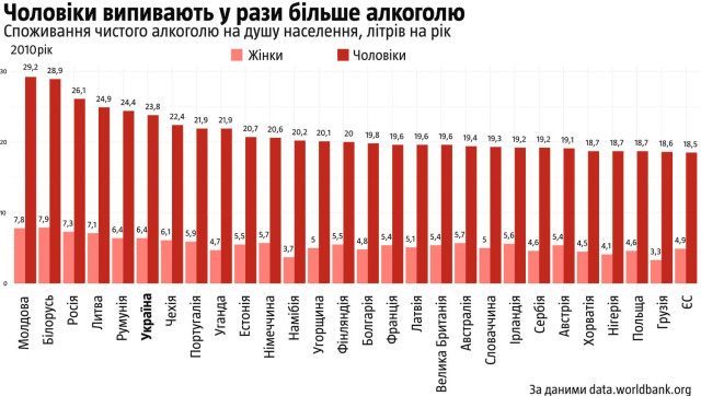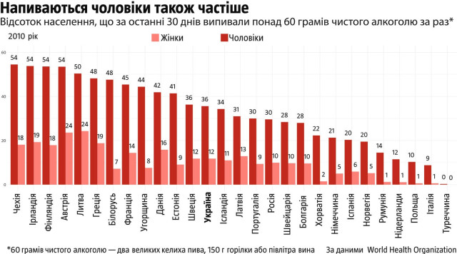 Згідно зі звітом ВООЗ за 2014 рік, в Україні найбільш ризиковий патерн споживання алкоголю серед усіх країн світу. Це означає, що ми не лише багато п’ємо, а й робимо це неправильно.