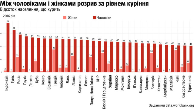 В Україні регулярно курить 47% чоловіків і 14% жінок. За відсотком курців ми входимо в топ-20 серед країн світу. У нас також значний розрив між чоловіками та жінками за рівнем куріння: у європейських країнах він значно менший. Чоловіки ходять на перекури частіше, ніж жінки. Тож маємо ще одну причину передчасної смертності саме чоловіків.