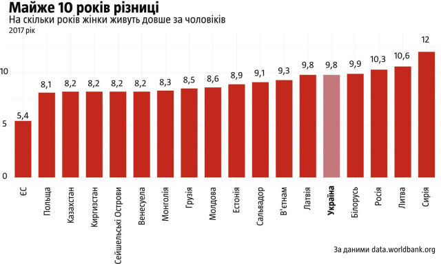 У європейських країнах після Другої світової війни тривалість життя постійно зростала. Однак у пострадянських країнах не було стабільного тренду, і вона то зростала, то скорочувалася. Як наслідок, за цим показником нині ми досі перебуваємо на рівні 1960-х років. Мала середня тривалість життя українців пов’язана з передчасною смертністю чоловіків. У жінок в Україні тривалість теж невисока, але не настільки кардинально відрізняється від країн європейського регіону. Наприклад, порівняно з ЄС чоловіки в Україні живуть на 11 років менше, а жінки — лише на 7. Тобто причина не лише в зубожінні та Чорнобилі, на що прийнято списувати ці проблеми. Щось наші чоловіки роблять не так, як європейські. А щось відрізняє чоловіків і жінок в усьому світі, спричиняючи такі розбіжності (див. «Майже 10 років різниці»).