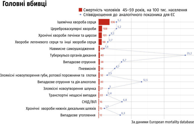 Щоб зрозуміти, чому українські чоловіки так рано помирають, ми розглянули причини передчасної смертності у віковій групі 45–60 років і порівняли їх із причинами смертності в країнах ЄС. Найпоширеніші причини смерті чоловіків зазначеного віку такі: хвороби кровоносної системи (інфаркти, інсульти, гіпертензія, кардіоміопатії), рак, травми та хвороби травної системи (див. «Головні вбивці»). За більшістю причин коефіцієнти смертності в Україні у три-чотири рази вищі, ніж у країнах ЄС. Це означає, що в Євросоюзі чоловіки середнього віку помирають менше. У нас чітко видно, що ранню смертність зумовлюють передусім кілька хвороб.