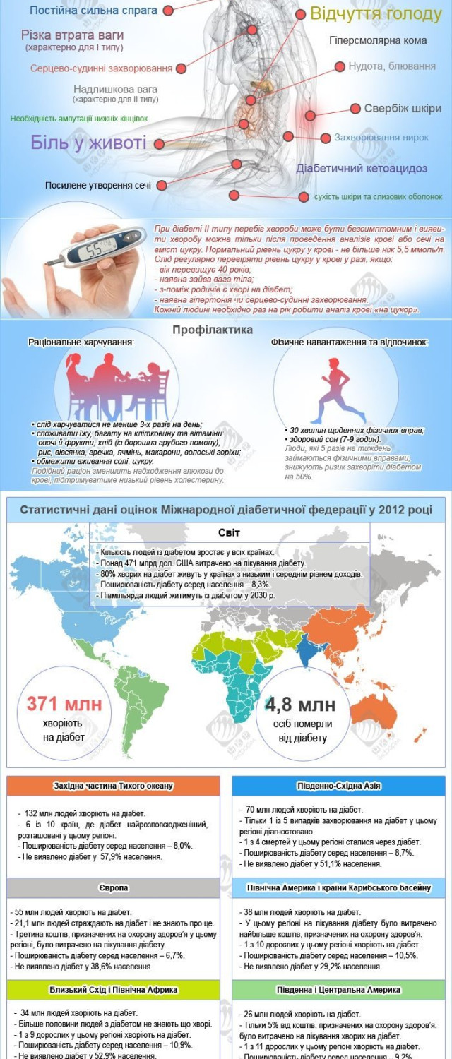 На ілюстрованій схемі подані статистичні дані про рівень захворюваності в світі, прогноз розвитку хвороби у жителів планети до 2030 року. Описано десять країн, населення яких найбільше страждає від діабету (у першій п'ятірці - Китай, Індія, США, Бразилія, Росія).