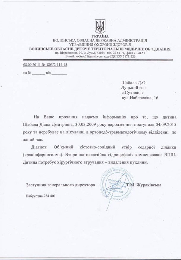 7-річній волинянці потрібні кошти для порятунку її життя. У дівчинки - діагноз об'ємний кістозно-солідний утвір солярної ділянки (краніофарингиома). Пацієнтці необіхдне видалення пухлини на мозку.