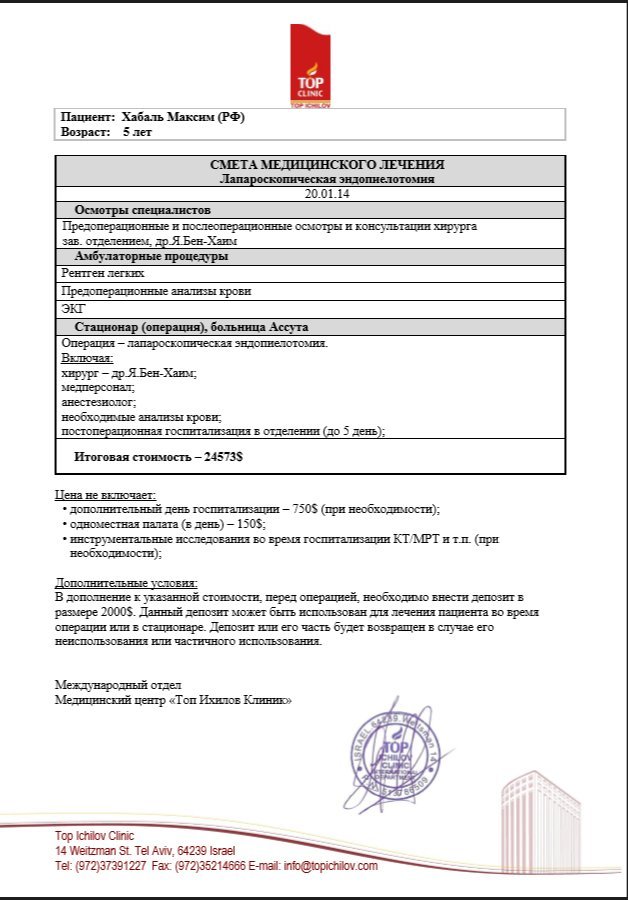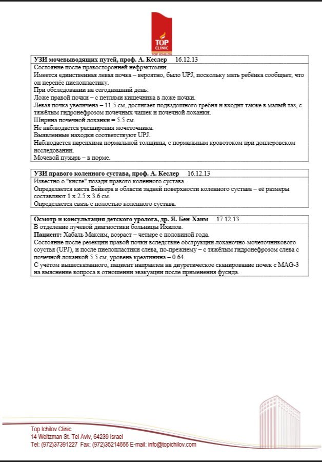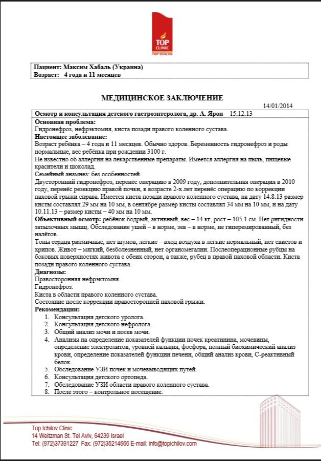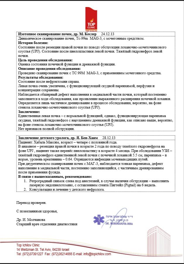 Українські лікарі ставлять питання про пересадку нирки та не дають втішних прогнозів, адже залишилась єдина нирка. Поки моя дитина усіма силами бореться без гемодіаліза, проте резерви маленького організму не безмежні. На жаль, це не єдина проблема, в вересні 2013 р. виявили гігрому в підколіному суставі (Кіста Бейкера), яку теж треба видаляти і проходити певний курс реабілітації. Ми, батьки, в пошуках виходу з даної ситуації звернулися за допомогою в різні закордонні клініки, відсилаючи запити в Німечину, Польшу та Ізраїль. Отримавши відповідь з клініки «Ихилов - Сураски» в м. Тель-Авів, в січні 2013 року пройшли комплексну діагностику нирки, що дала нам надію на успішне лікування нашої дитини. Лікарі запропонували зробити операцію - лазерну ендопіелотомію з залишеним стентом Пигтейл. Дана операція є найменш травматичною для дитини і дає хороші результати. Ми покладаємо велику надію на закордонних лікарів і сучасні методи лікування! Адже попередні операції проведені в Україні не покращили нашого стану і всі запропоновані маніпуляції призводять лише до погіршення фізичного стану усього організму в цілому! Нирка залишилась єдина, функціональні можливості якої дуже знижені.
