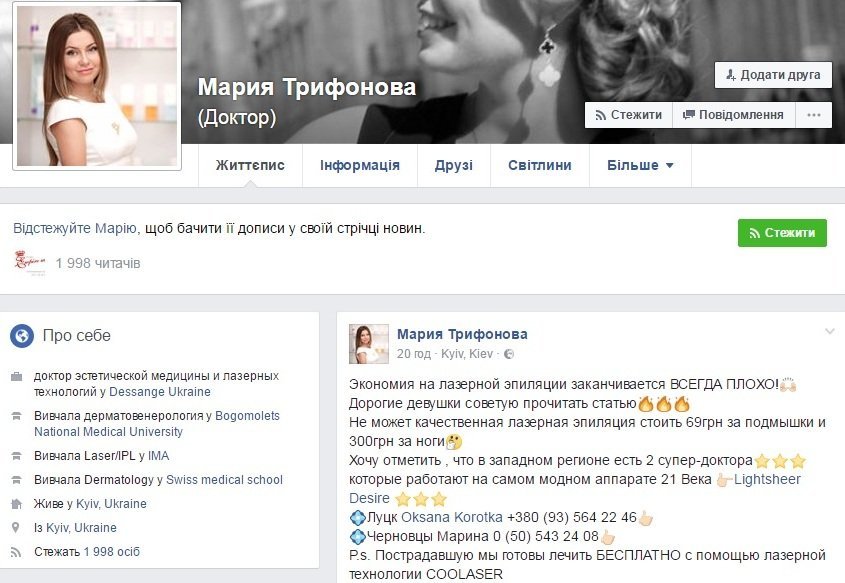«Экономия на лазерной эпиляции заканчивается всегда плохо! Дорогие девушки, советую прочитать статью. p.s. Пострадавшую мы готовы лечить бесплатно с помощью лазерной технологии COOLASER», - лишила допис на своїй сторінці у Facebook лікар естетичної медицини і лазерних технологій Марія Тріфонова. Вона рекомендувала до співпраці колегу з Луцька - дипломованого косметолога-естетиста Оксану Коротку. Пані Оксана підтвердила ІА Волинські Новини, що готова надати безплатну допомогу, а при потребі, постраждалу можуть оглянути спеціалісти у Києві.