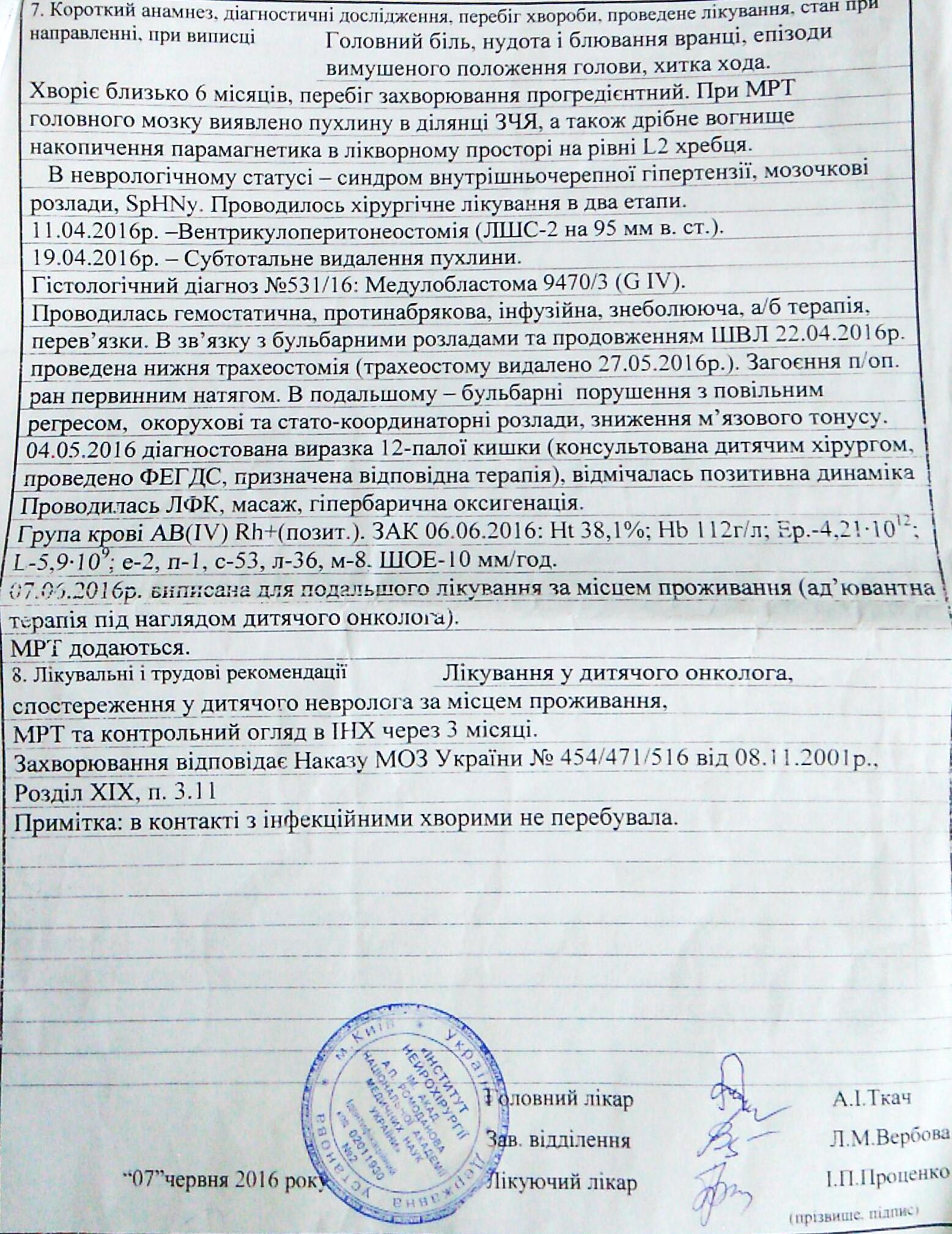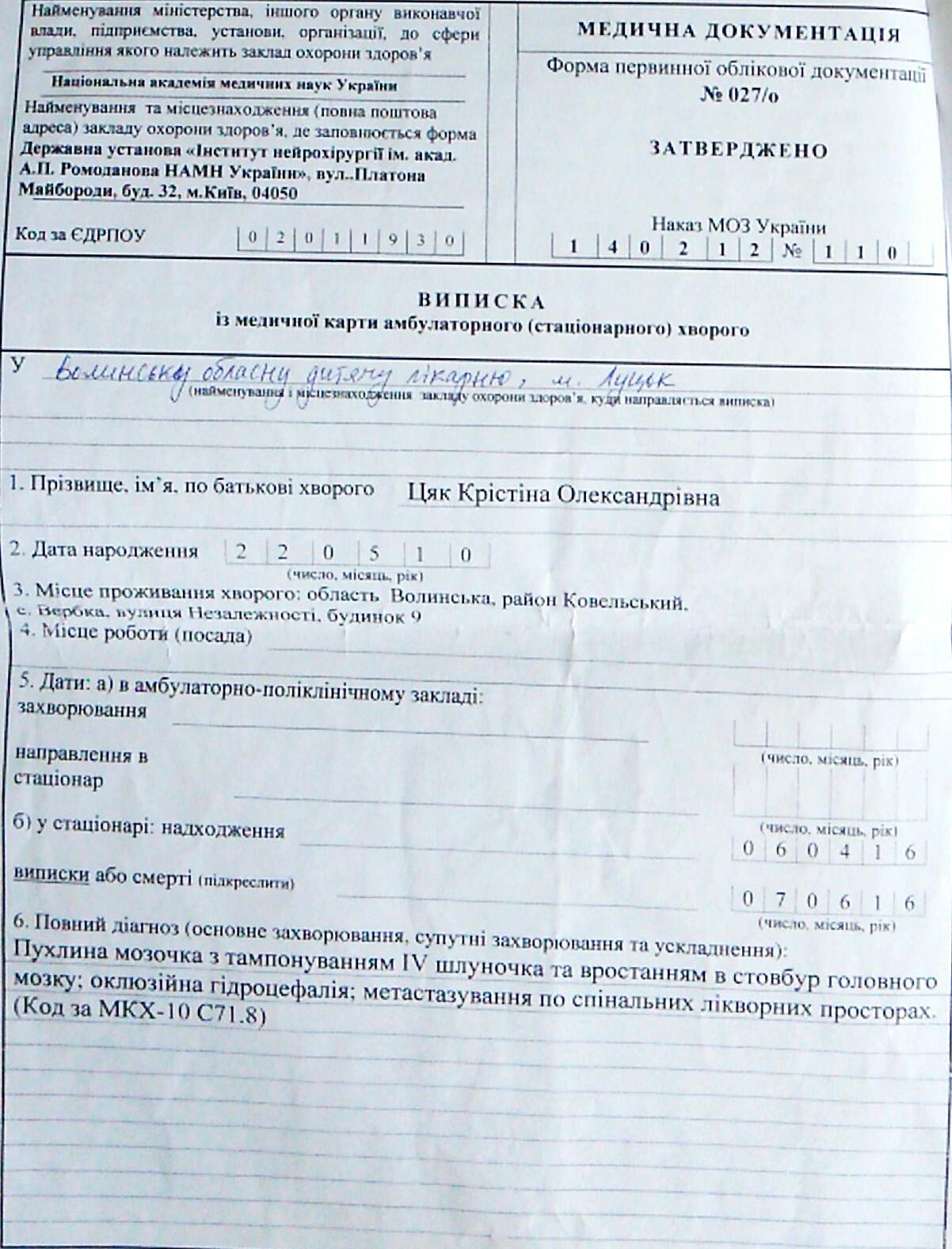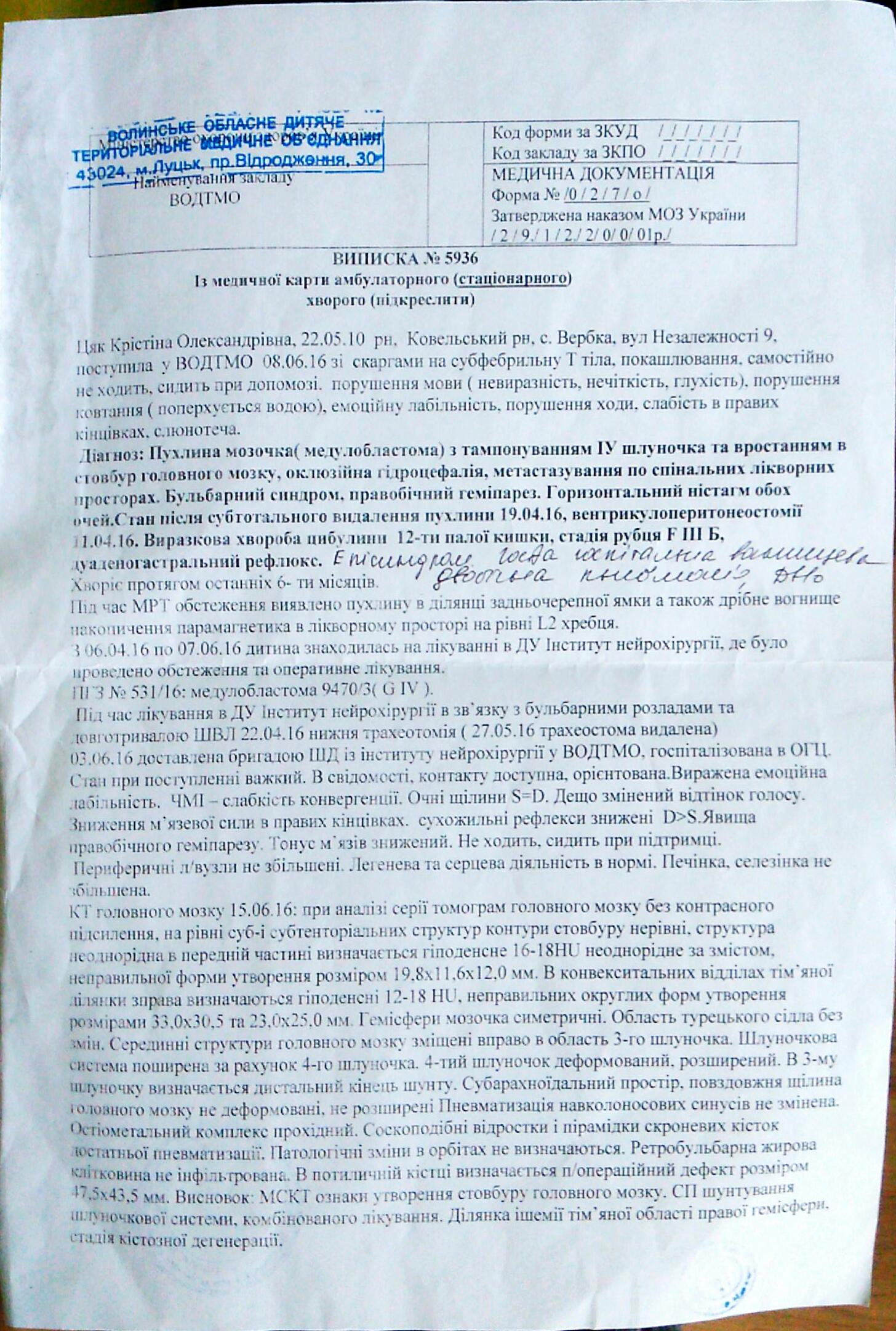 "Допоможіть врятувати дівчинку Крістіну!!! Півроку тому дівчинці встановили страшний діагноз пухлина мозочка (медулобластома) з метастазуванням у спинний мозок, зробили 2 операції в Києві в інституті нейрохірургії, зараз дівчинка проходить курси хіміотерапії, сама не ходить. Просимо не байдужих людей допомогти молодій родині", - йдеться у повідомленні.