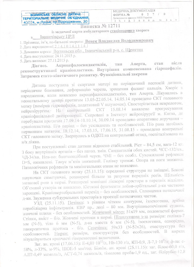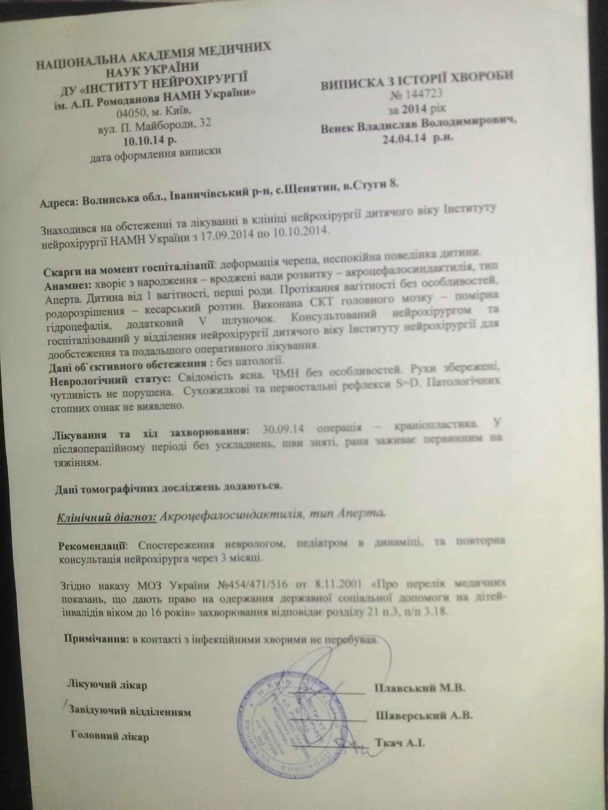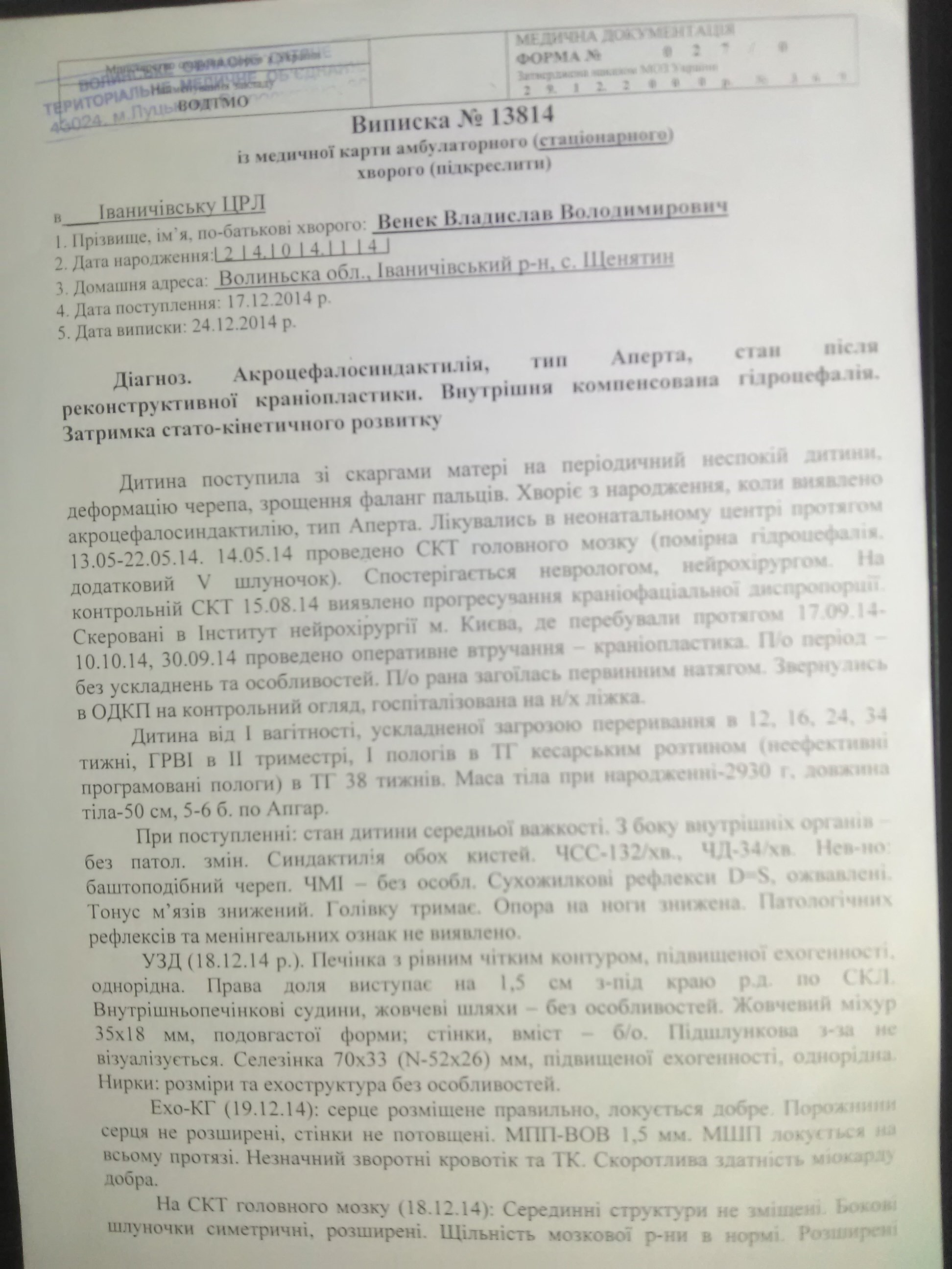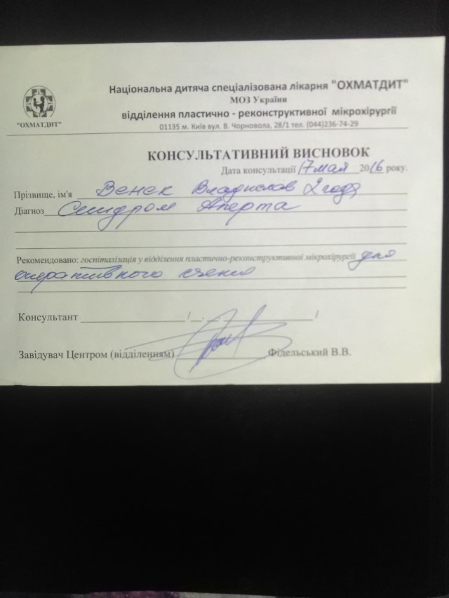 У 2014 року у Києві, в інституті нейрохірургії імені А.П. Ромоданова НАМН України, малюку зробили операцію - краніопластику, але лікарі наполягають на ще одній.
