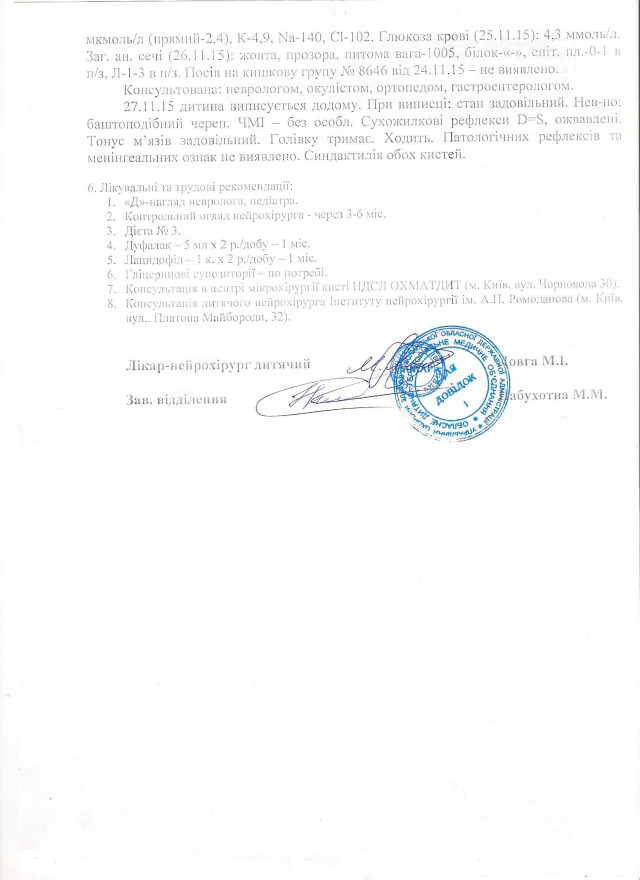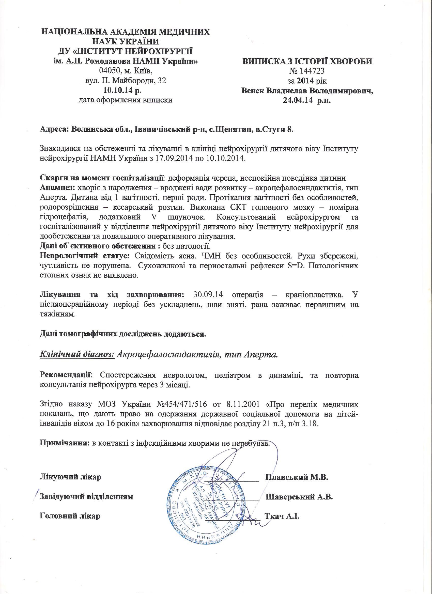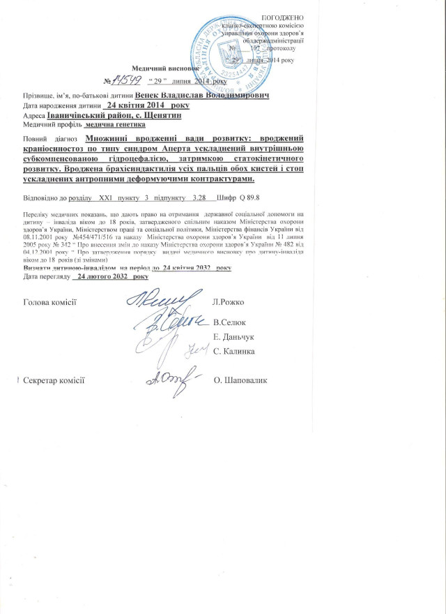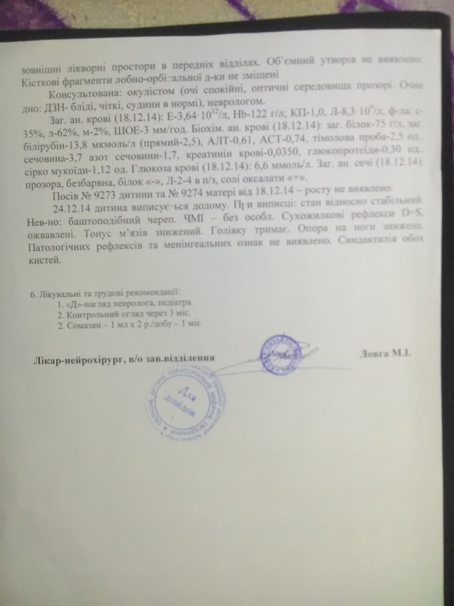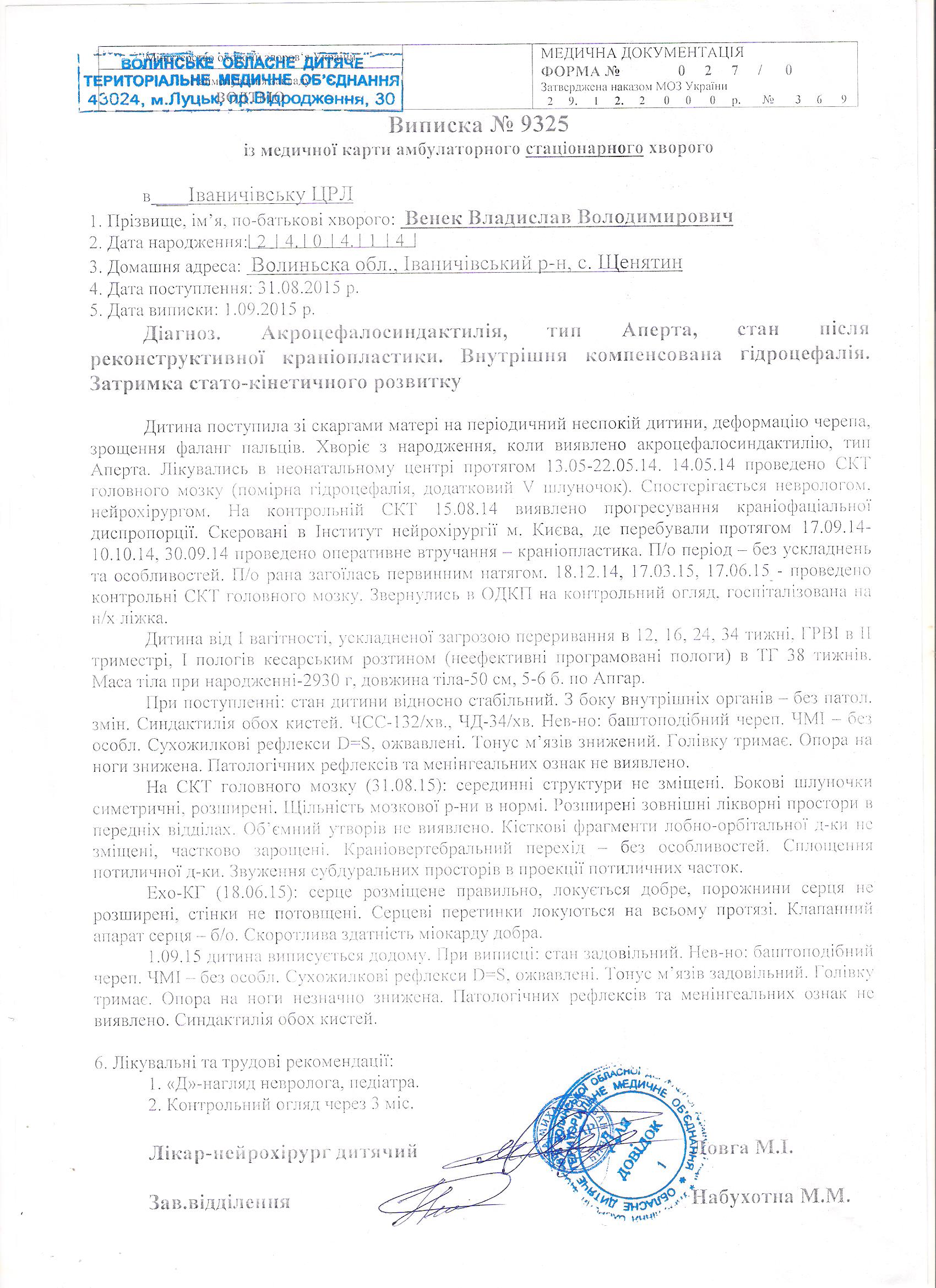 У 2014 року у Києві, в інституті нейрохірургії імені А.П. Ромоданова НАМН України, малюку зробили операцію - краніопластику, але лікарі наполягають на ще одній.