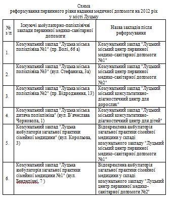 Луцькі медики підготували схему реформування галузі охорони здоров’я міста. Вони провели широке інформування громадськості про необхідність впровадження змін. Крім того, вони вивчали позицію населення та медичної громадськості щодо зміни порядку надання медичної допомоги. Попередньо фахівці також визначили потреби у кадрових та матеріально-технічних ресурсах.