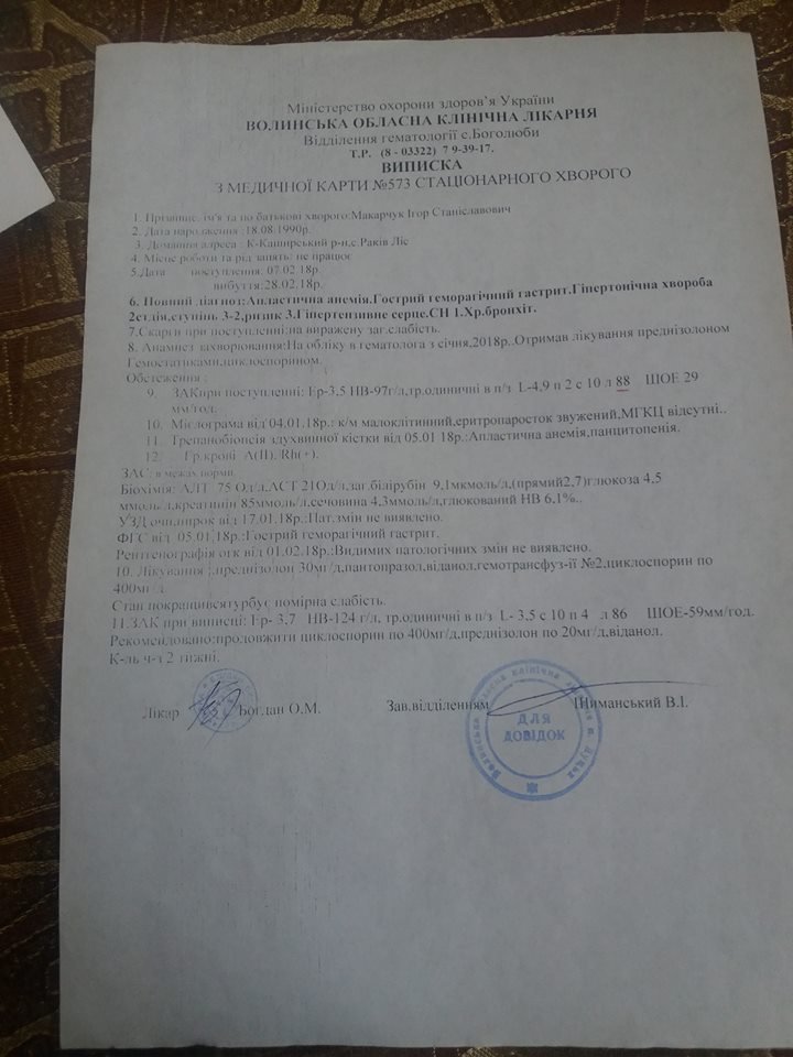 За результатами пунктування у Волинській обласній клінічні лікарні поставили діагноз: апластична анемія. Провели переливання крові, 21 березня 2018 в Києві підтвердили діагноз і на підставі зроблених аналізів - порекомендували терміново проводити пересадку кісткового мозку. 27 березня 2018 р. медична комісія встановила І групу інвалідності.