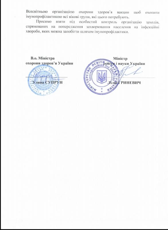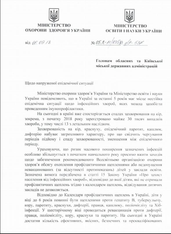 «Враховуючи, що ризик масового поширення зазначених інфекцій особливо збільшується з початком навчального року просимо вжити заходів щодо забезпечення рекомендованого Всесвітньою організацією охорони здоров'я обсягу охоплення профілактичними щепленнями або недопущення невакцинованих (за відсутності протипоказань) дітей у заклади освіти», – йдеться в документі.