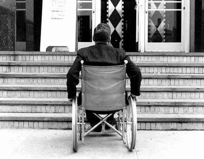 Якщо в пенсійному фонді і можна скористатись пандусом, то потрапити на другий поверх на прийом до керівництва неможливо, оскільки ліфт відсутній; кнопки виклику здебільшого не працюють. А в лікарні ліфт є, але непристосований під інвалідні візки.