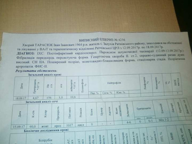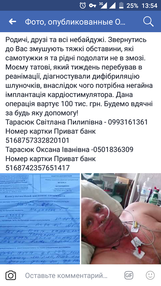 «Родичі, друзі та всі небайдужі. Звернутись до Вас змушують тяжкі обставини, які самотужки я та рідні подолати не в змозі. Моєму татові, який тиждень перебував в реанімації, діагностували дифібриляцію шлуночків, внаслідок чого потрібна негайна імплантація кардіостимулятора. Дана операція вартує 100 тис. грн. Будемо вдячні за будь-яку допомогу», – повідомила дочка хворого.