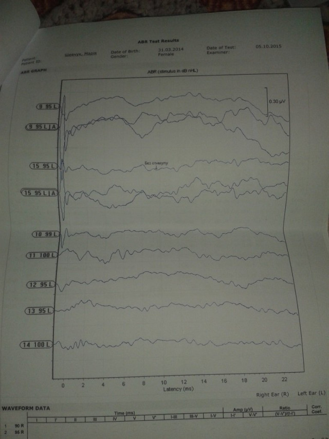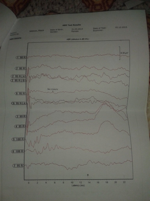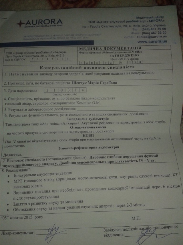 Через сильні антибіотики Марія втратила слух. Діагноз – сенсоневральна глухота. Відсутність слуху впливає на мовленнєвий розвиток. Марія не чує і не говорить.