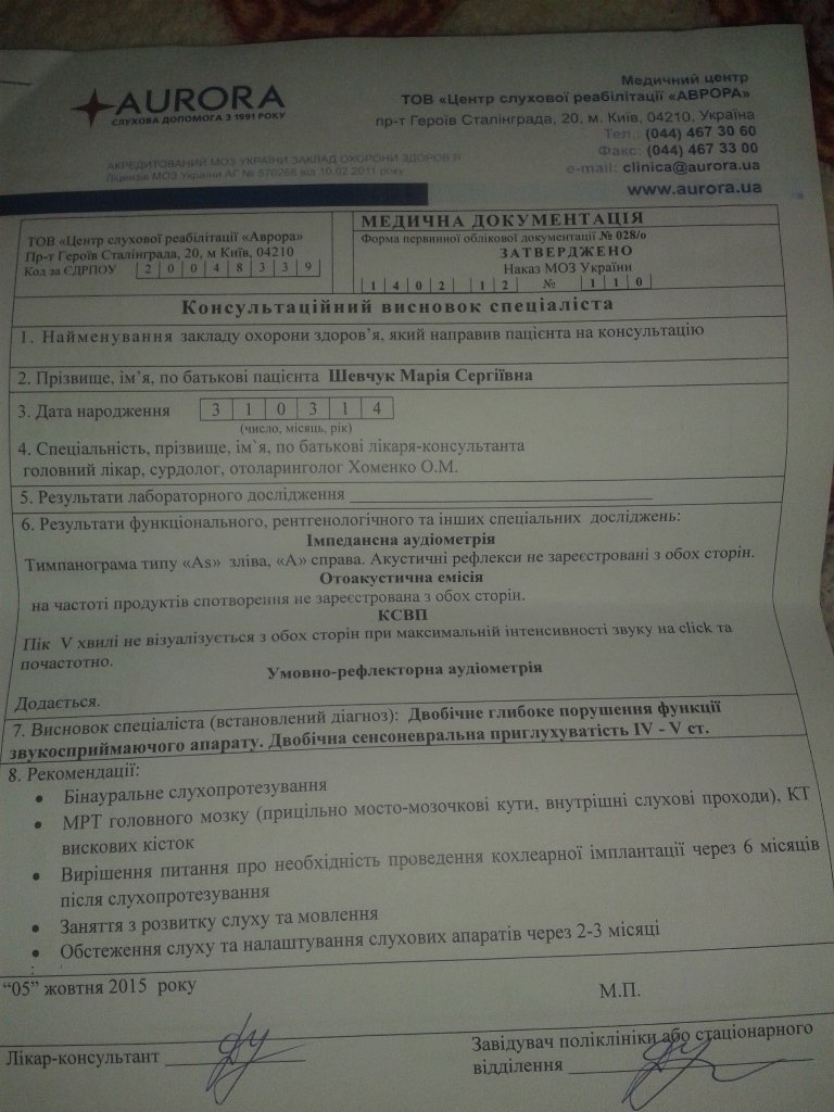 Таня 0976672764 мій тел.позвоніть дещо вам розповіи.Маю таку саму дитину уже 4 роки з імплантом.Розповім де можете за доступну ціну придбати імплант.