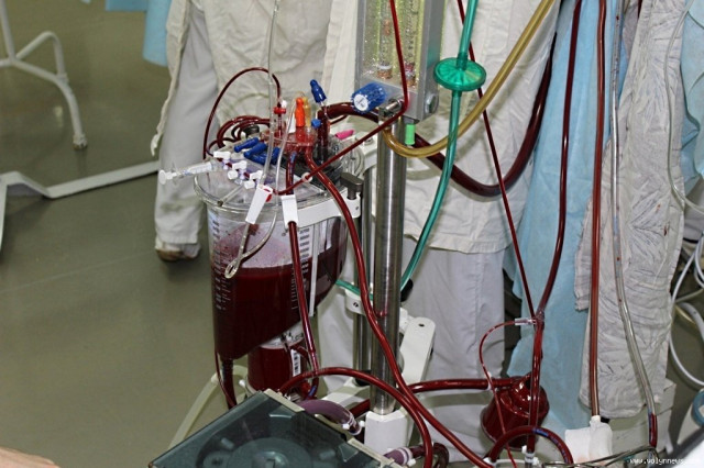 «Ми робимо протезування аортального клапану на зупиненому серці. При цьому використовується апарат штучного кровообігу з одноразовою системою (теплообмінник, коронарна планка, основні насоси, один з яких виконує функцію серця, а інший – функцію легень). Ми зараз на основному етапі операції. Це апарат німецького виробництва, після використання викидається на утилізацію», - коментує процес лікар-анестезіолог Віктор Олексюк.