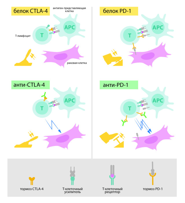 Зліва вгорі: Активація Т-лімфоцита вимагає, щоб рецептор кров'яного тільця зв'язувався зі структурами інших імунних клітин, розпізнаних як «чужі». Для активації Т-лімфоцитів необхідний білок, що функціонує, як їх прискорювач. CTLA-4 працює як гальмо, що блокує функцію цього підсилювача.