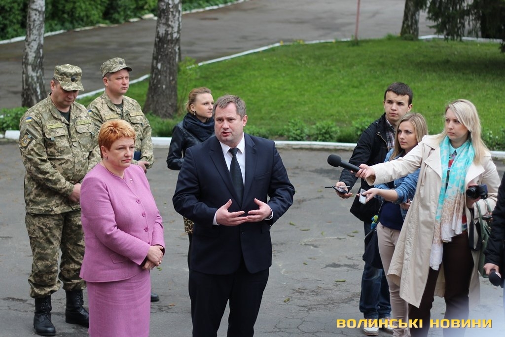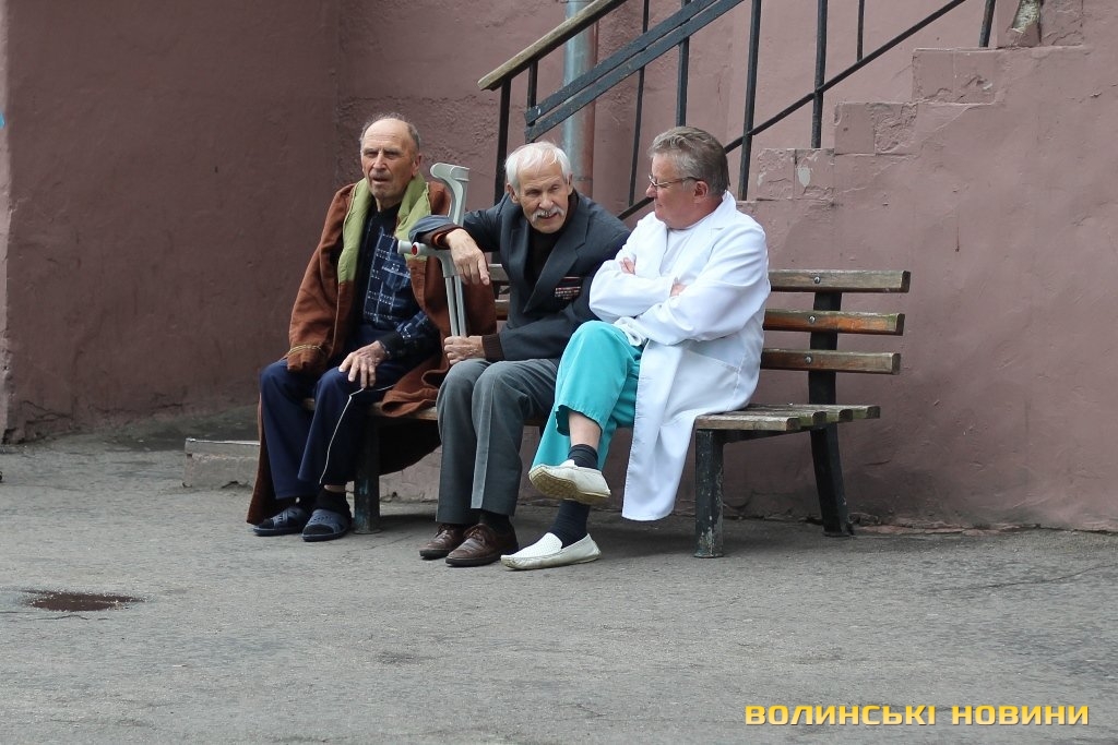 Об 11.30 на вулиці ще падав невеликий дощ. З одного боку майданчика перед госпіталем під деревом чекали приїзду голови облради - військовий комісар, заступник голови ОДА Світлана Мишковець, радник голови ОДА Борис Кондратюк, головний лікар госпіталю Олександр Хоменко.А з іншого – під дашком речового та аптечного складів, в ряд, стояли ті, хто лікується в госпіталі, заради яких і прийшли волинські чиновники.Коли всі зібралися – зійшлися ближче, та одного гурту якось не вийшло.«Дуже приємно мені стояти разом з вами на своїй землі», – почав свій виступ голова облради Валентин Вітер. «Ви – дійсно Герої України. Бо якщо ви в цьому закладі, то ви віддали частинку свого здоров’я, свого життя за нас. Приємно, що є такі люди, які є символом нації, які стали на захист нашої Вітчизни. Приємно, що тут є ветерани Другої світової війни і ветерани сучасної війни», - пояснює «приємнощі» голова Волиньради.