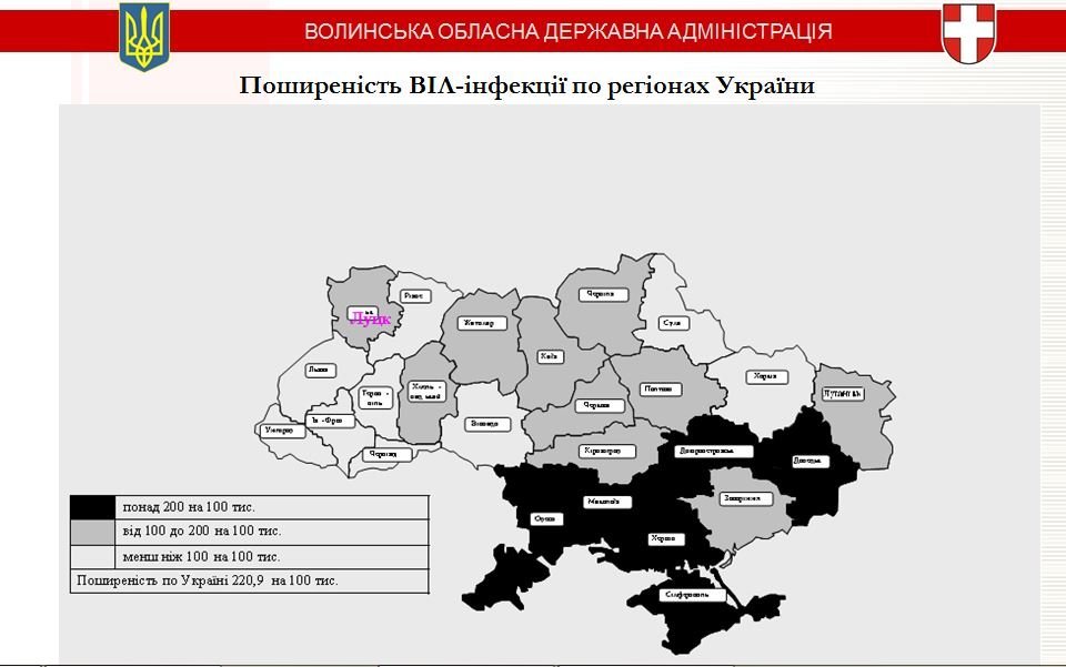 Загалом в Україні найбільше ВІЛ-інфікованих на півдні держави. Там більше 200 хворих на 100 тисяч населенняВолинська область знаходиться в зоні підвищеного рівня захворюваності: на 100 тисяч населення реєструють від 100 до 200 інфікованих.