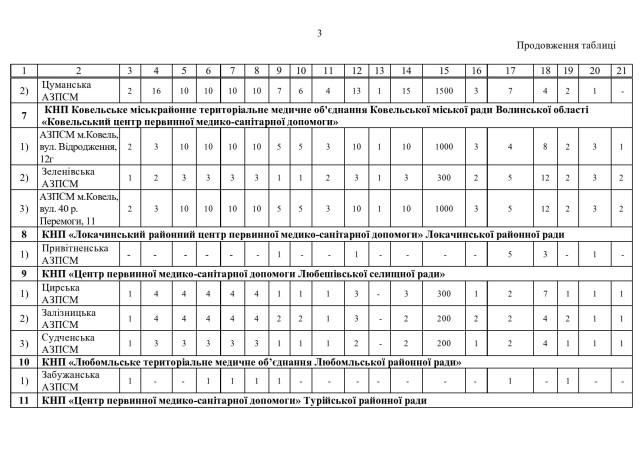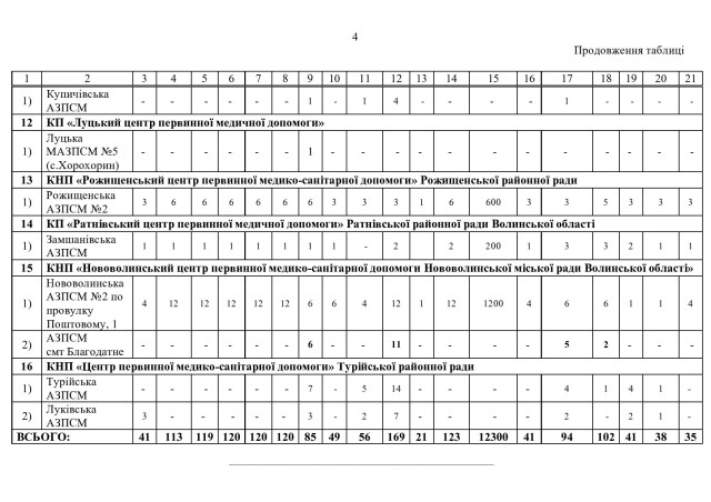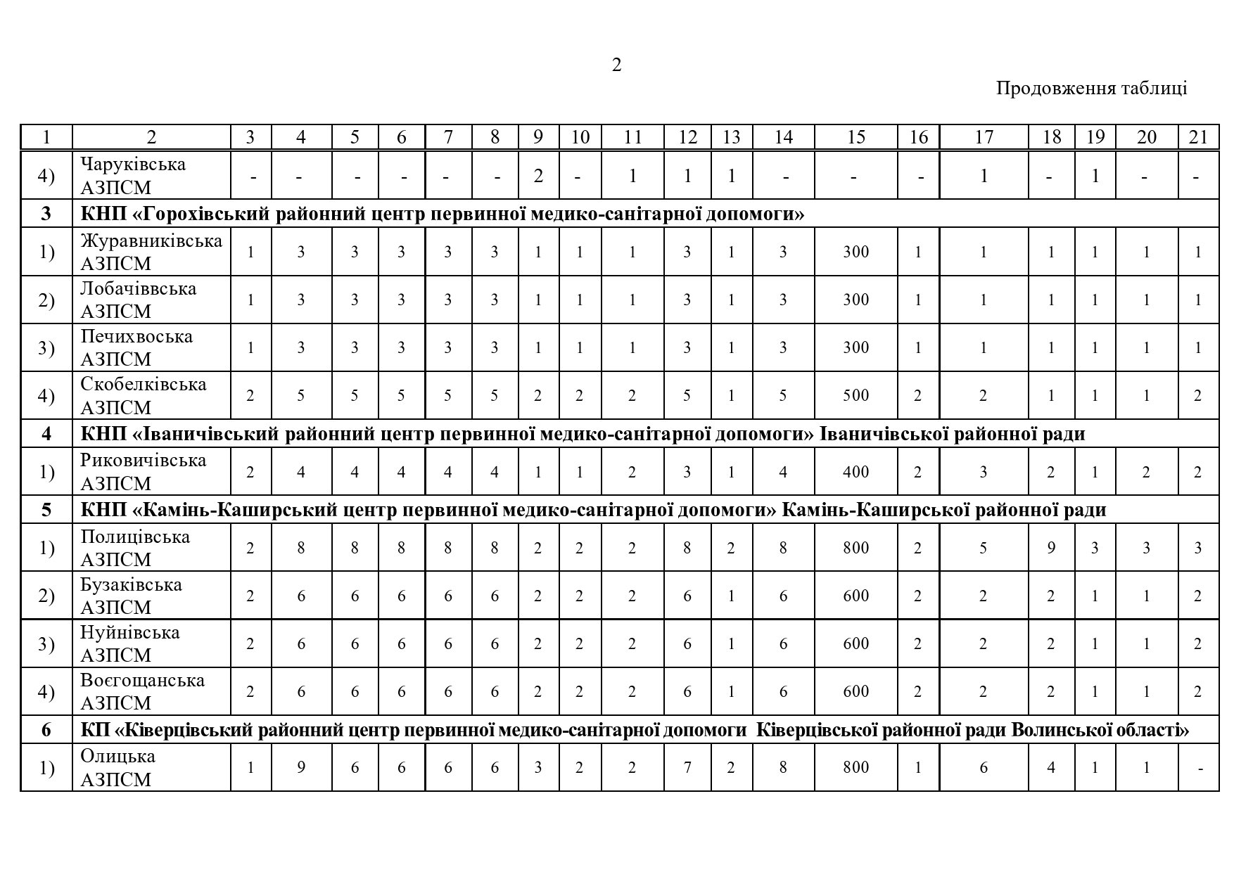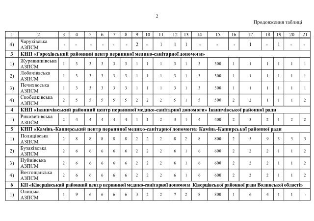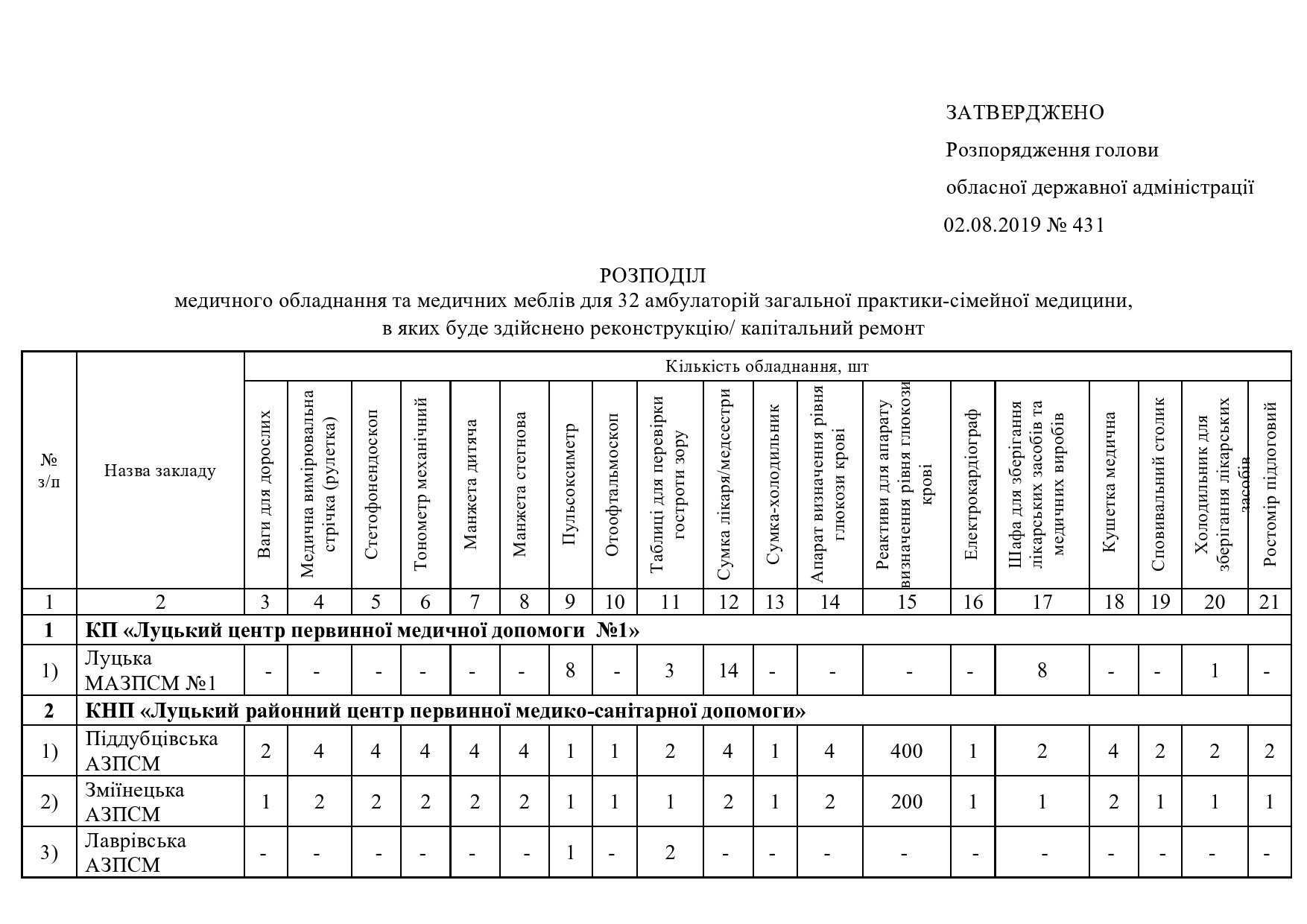 Йдеться про розподіл таких одиниць обладнання та медичних меблів: ваги для дорослих, медична вимірювальна стрічка (рулетка), стетофонендоскоп, тонометр механічний, манжета дитяча, манжета стегнова, пульсоксиметр, отоофтальмоскоп, таблиці для перевірки гостроти зору, сумка лікаря/медсестри, сумка-холодильник, апарат визначення рівня глюкози крові, реактиви для апарату визначення рівня глюкози крові, електрокардіограф, шафа для зберігання лікарських засобів та медичних виробів, кушетка медична, сповивальний столик, холодильник для зберігання лікарських засобів, ростомір підлоговий.
