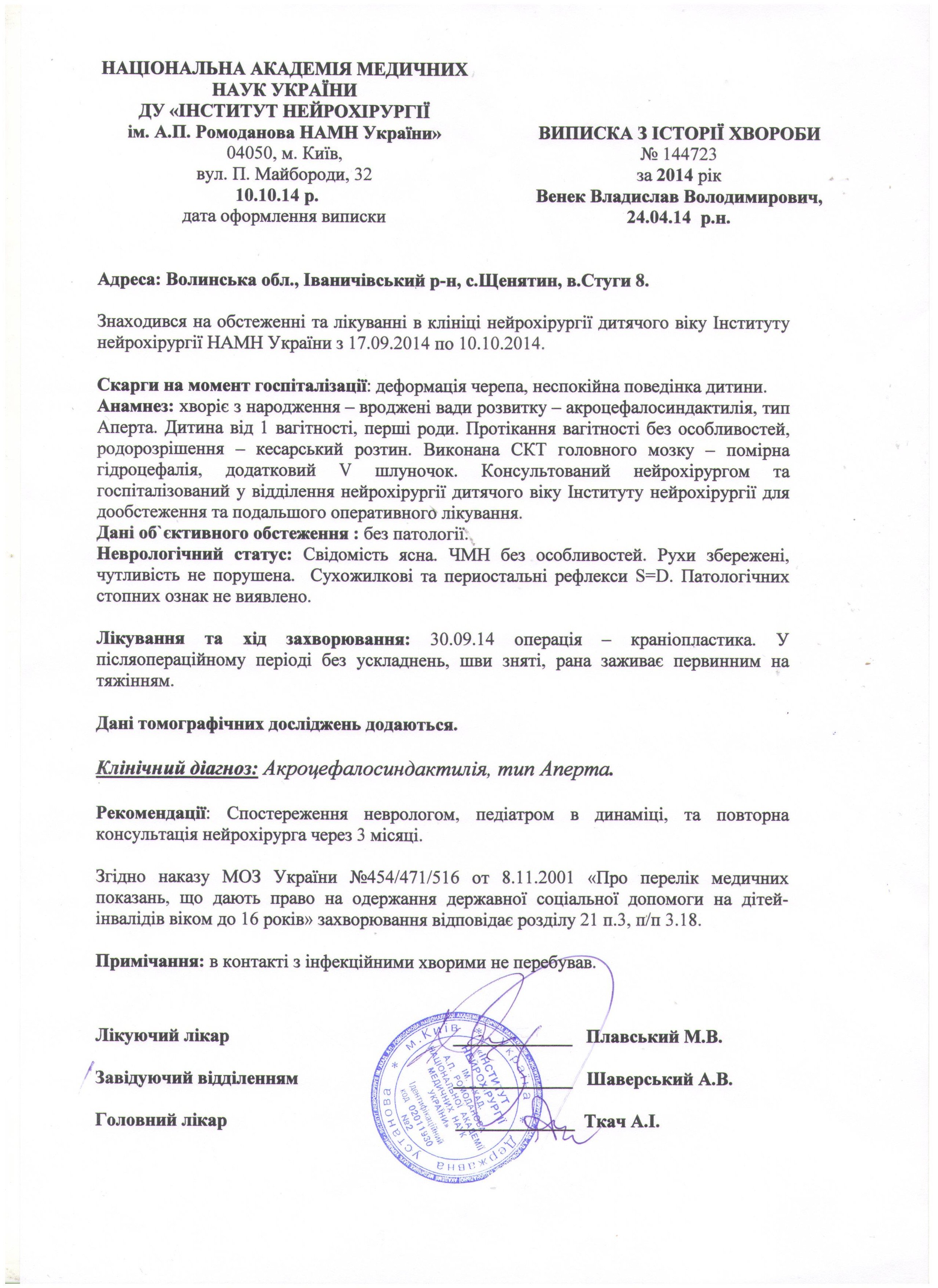 30 вересня 2014 року у Києві, в інституті нейрохірургії імені А.П. Ромоданова НАМН України, малюку зробили операцію - краніопластику, але лікарі наполягають на ще одній.