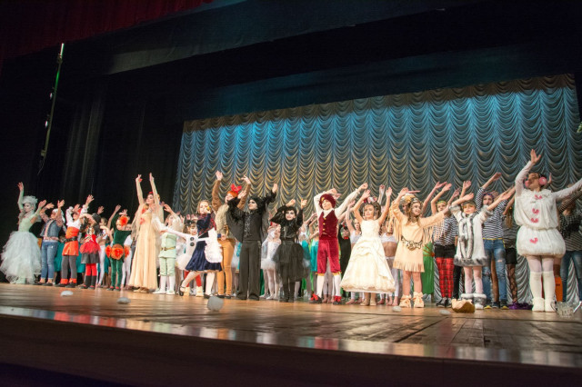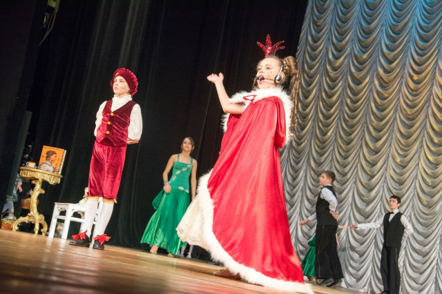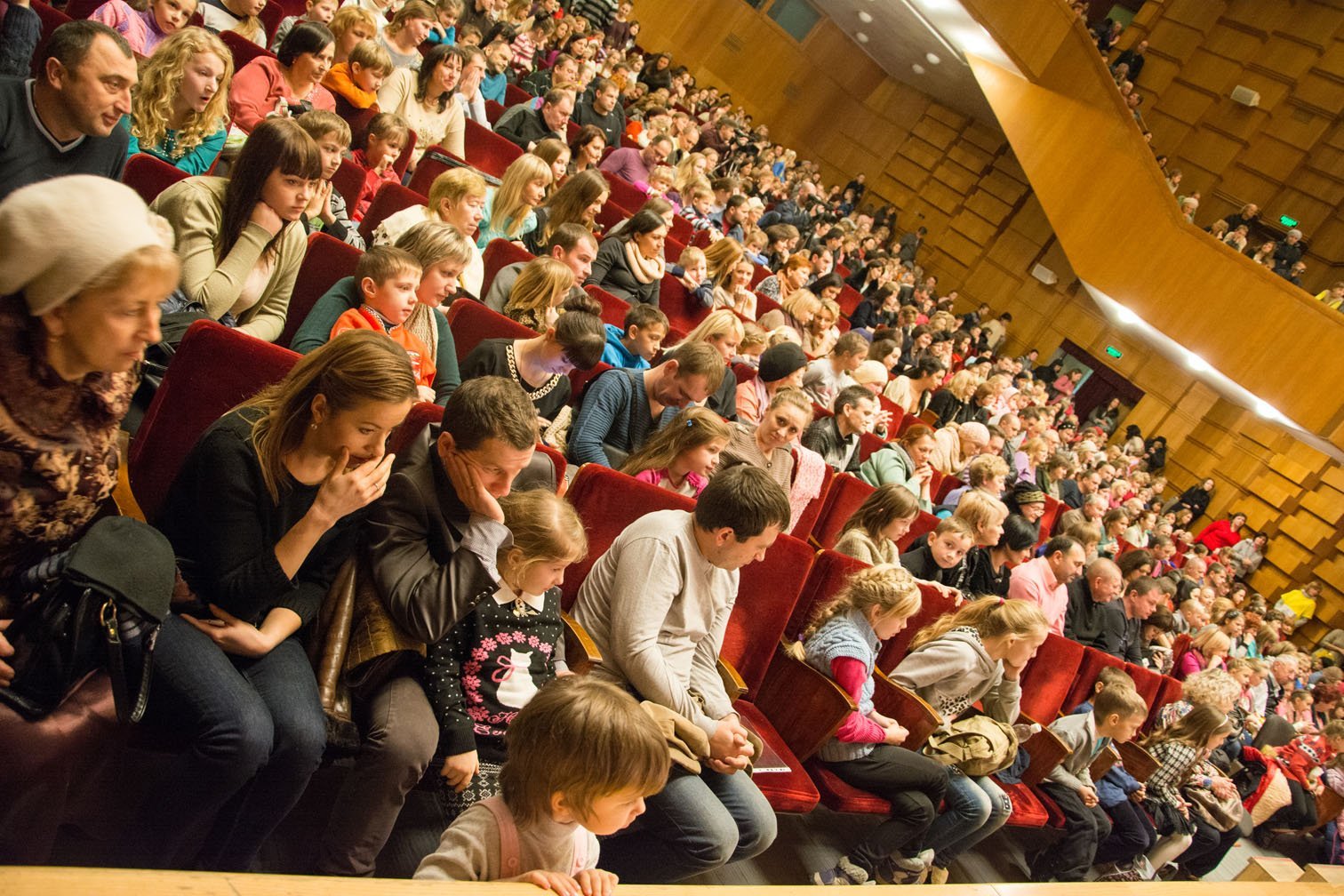 В залі обласного театру був аншлаг. Багатьом дорослим, охочим подивитися виставу, довелося стояти в проходах залу. Серед глядачів було дуже багато дітей.