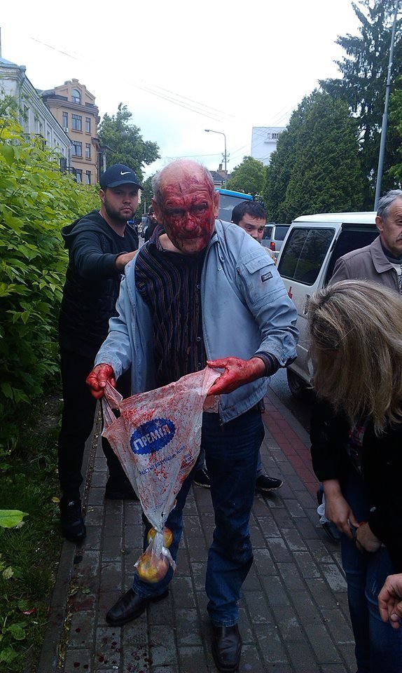 Після наполегливих вмовлянь активістів, медики таки вийшли з машини і промили постраждалому обличчя. Чоловіка забрала в лікарню карета швидкої допомоги, яка приїхала на виклик.