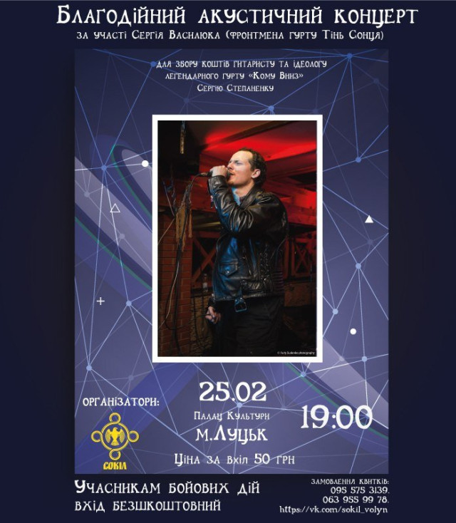 Благодійний концерт за участю лідера гурту «Тінь Сонця» Сергія Василюка відбудеться у Луцьку в суботу, 25 лютого. Захід розпочнеться о 19:00 у Палаці культури міста Луцька (вул. Богдана Хмельницького, 1), повідомляють організатори.