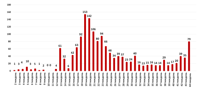 Динаміка захворюваності кором у 2018 році в області (в абсолютних цислах) по тижнях.Як повідомлялося, через спалахи кору на Волині до 11 листопада продовжили канікули у декількох школах.
